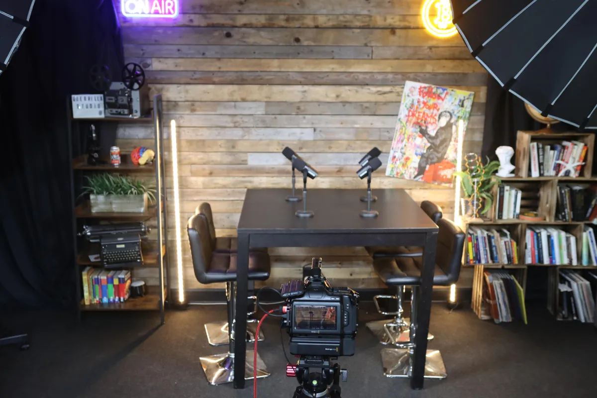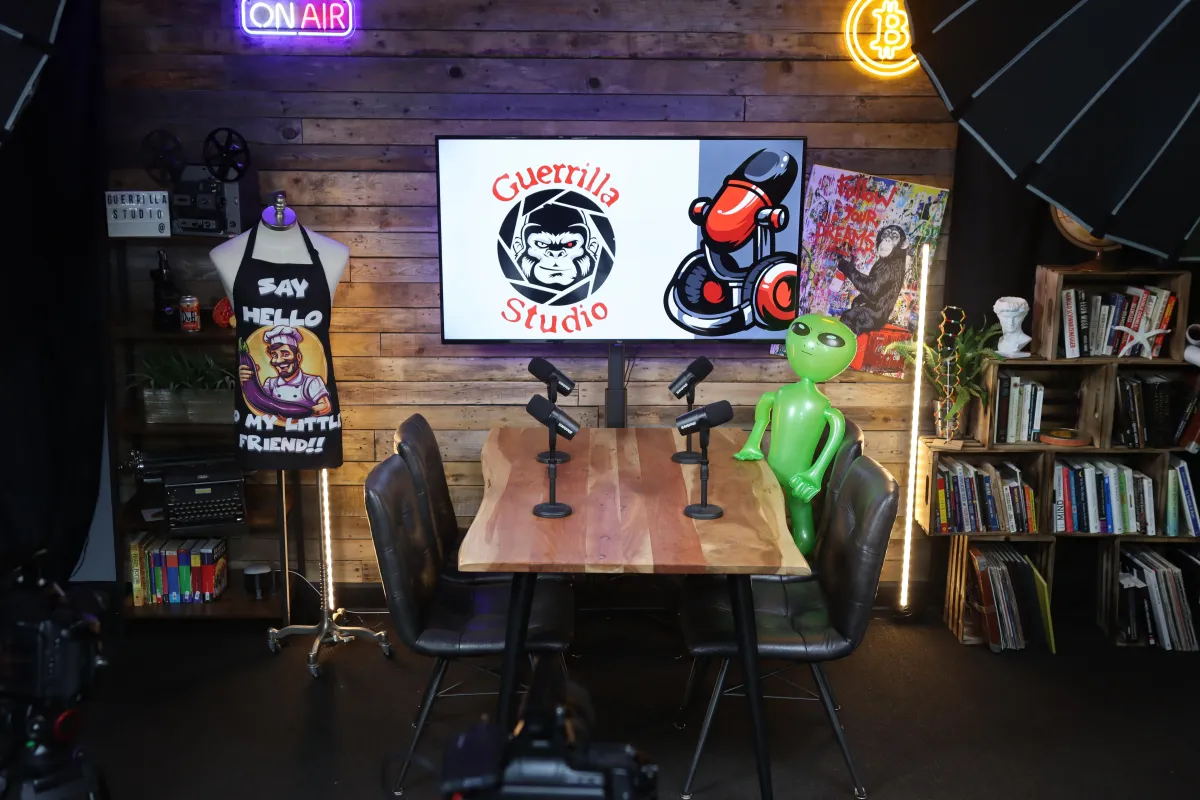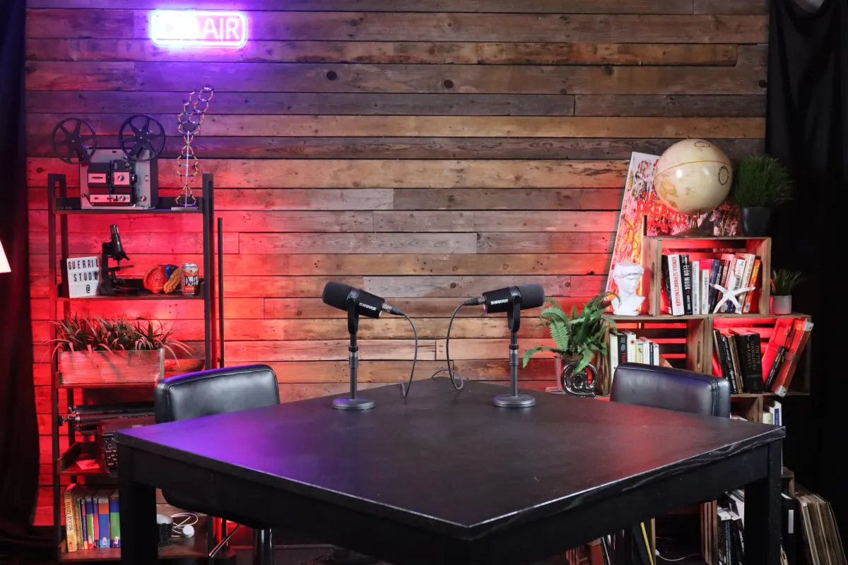 En plus de cela, tu as accès à une large gamme d'accessoires, et tu es libre d'apporter les tiens pour ajouter une touche personnelle. Une télévision est également disponible pour afficher ton logo, diffuser des images, ou accueillir des invités en vidéoconférence, rendant tes podcasts encore plus interactifs et engageants.